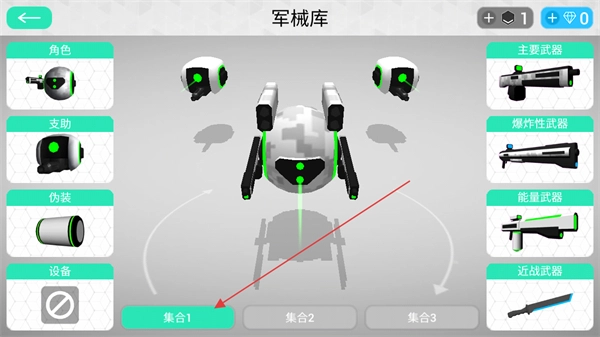 1、点击下方的集合选项,能够装配适用于不同场合的机器人装备,进入战场后还可以对集合进行选择。