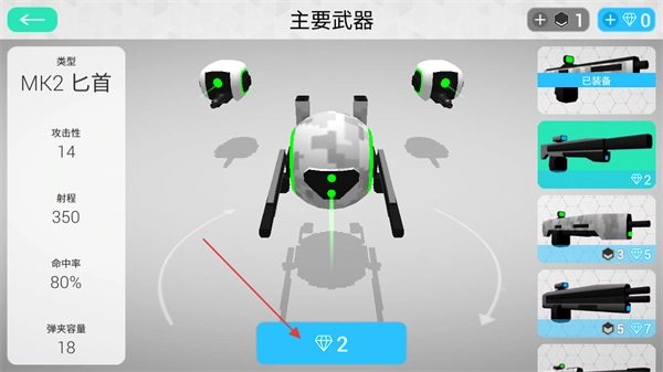 2、点击右侧武器栏,可以根据左侧的武器信息进行选择,点击下方的按钮花费一定数量的钻石进行购买。