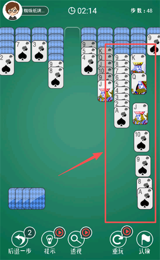 1这款游戏精准复刻了经典蜘蛛纸牌的核心玩法,采用两副扑克牌展开对局,玩家需将所有牌按照从K到A的顺序依次排列组合。