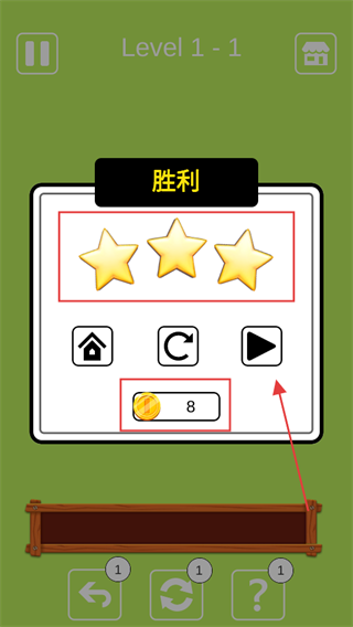 4完成关卡后可获得【三颗星】评价以及【8】枚金币的奖励,点击向右箭头就能继续挑战下一关,进一步提升游戏成就。