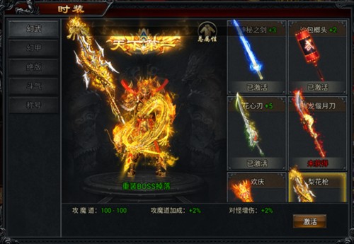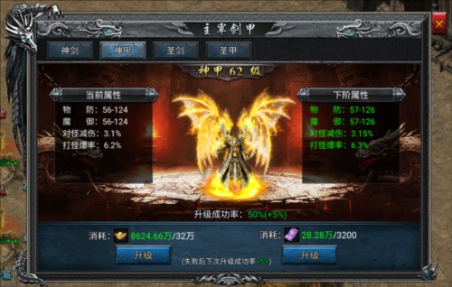 2、幻武、幻甲和斗气可以通过升级再次提升各个属性;其中幻武和幻甲可以通过消耗时装碎片升级,时装碎片可以通过击杀BOSS获得;斗气都通过消耗相应的斗气升级。