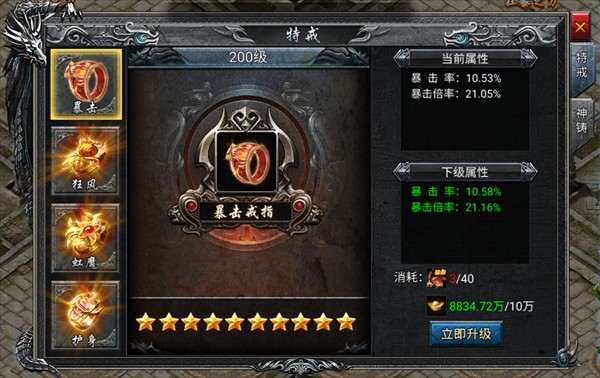 4、特戒系统:特戒分为多种,每种都具有独特属性,升级特戒可以增强这些属性。特戒的升级需要特戒碎片和元宝,还可进行神铸以进一步增强属性。