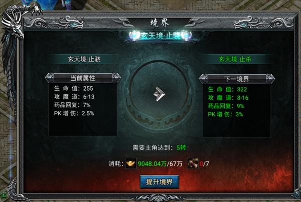 1、境界系统:此系统可大幅增强玩家的生命值、攻魔道等属性。玩家既能够前往盟重地图的指定NPC处完成境界晋升,也能借助界面进行升阶操作。提升境界需用到境界卷轴,这类卷轴可通过战斗、挂机副本等途径获取,若有多余的卷轴,还能将其合成来冲击更高的境界。