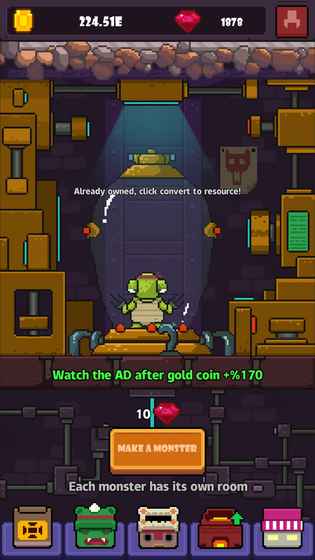 这是一款像素风格的模拟经营游戏,玩法十分简单,容易上手。你将在此经营一座全新的黄金矿藏。由于怪物们偷吃了人类的肌肉和蛋白质,它们的士兵都变成了行尸走肉。不过,黄金能够帮助怪物们保持清醒。你需要收集更多金币,完成所有任务,壮大你的商店,开启并成就属于你的大冒险之旅。