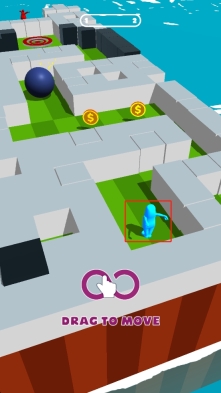 1、拖动蓝色小人,沿迷宫路径移动,避开障碍,收集金币,留意路径上的黑色球体等危险物,规划安全路线前行。