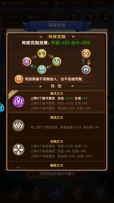 3、六大种族: 设计超60位英雄,涵盖神圣、暗影、奥数、亡灵、邪能、自然、传说七大种族。可灵活搭配英雄组建强力队伍,自由展开探险。