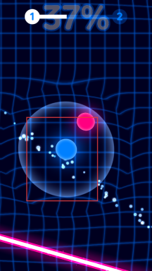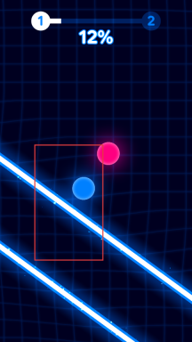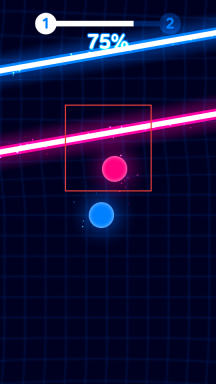 1、用手指滑动控制红蓝双球旋转移动,让蓝球避开蓝色激光,红球躲开红色激光,同时别让两球碰撞,保持移动推进进度。
