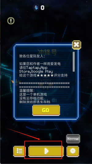1、在游戏的初始界面,点击底部红框所标注的“GO”按钮,接着选择“Normal”难度进入游戏,同时要留意开发者给出的关于存档的提示内容。