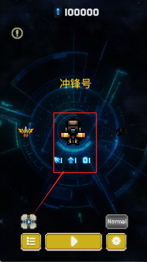 2、操控红框选中的"冲锋号"角色移动射击,观察左上角分数累积情况,利用左下角仓库图标管理装备道具。