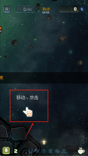 3、按照红框"移动、攻击"提示,使用手形操作区域控制角色走位,注意界面底部显示的波次和剩余敌人数。