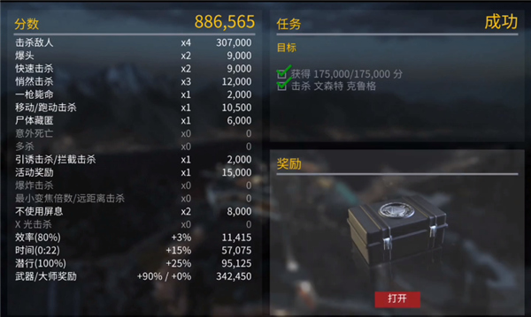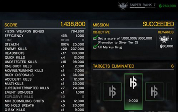 这是个单纯刷分的关卡,想顺利通过的话,建议选用分数加成最高的武器,尽量达成连续爆头击杀和秘密击杀。下面这张图是我过关时的分值构成情况,当时用的是6级的NARCISSUS枪支。
