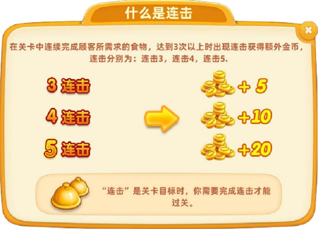 4、连连上菜:通过连击收集额外金币,达成额外金币目标营业额。