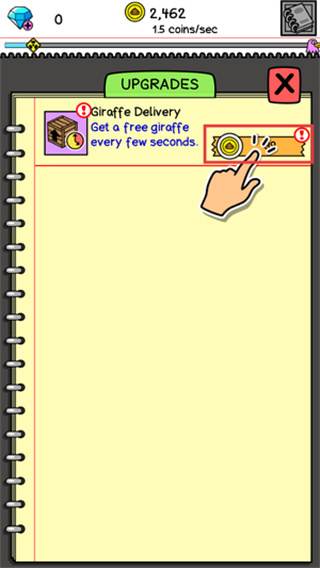 4、使用金币对GiraffeDelivery功能进行升级,升级完成后,每隔几秒系统就会自动为你发放一只免费长颈鹿,如此一来就能更加省心了。