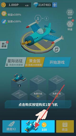 1、点击“100金币”按钮,购买飞机,填充机库;积累资源,为“星际远征”“黄金国”等模式,备机参战。