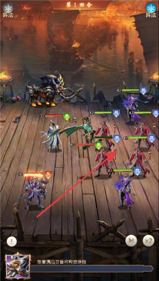 3、战斗第1回合,选择红色箭头所指的武将,释放其技能(例如“世墨澜发动强制冲锋技能”),并结合阵法效果,集中火力攻击敌方,以争取在回合制对战中取得优势。
