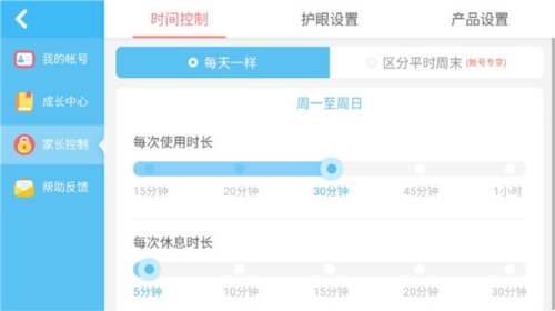 4、点击家长控制,这里能够控制孩子使用软件的时长,避免过度用眼;