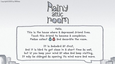《Rainy Attic Room》是一款充满趣味的文字剧情模拟小游戏,游戏整体笼罩在雨水淅沥的灰暗氛围里,而主角的内心也正被沉重的忧伤所困。玩家需要通过解谜与探索,帮助主角重新为生活添上色彩,治愈内心的创伤。你将与角色进行深入对话,逐步揭开故事的谜团;随着剧情推进,隐藏在阁楼深处的秘密以及主角的心灵过往也会慢慢浮现。通过与环境互动、收集物品、解开谜题等方式,你能唤醒主角内心的力量,让他重新寻回希望与幸福。