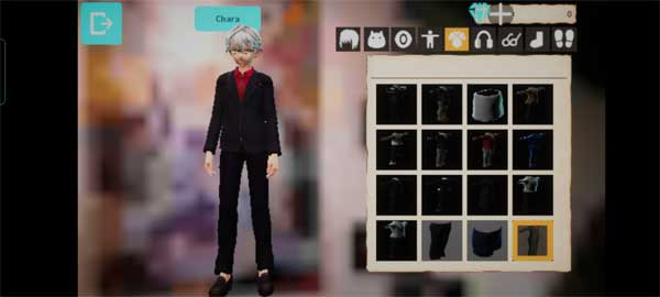 打开游戏后,首先需要设定角色形象。点击“Chara”按钮可以切换角色性别,待服装、发型、脸部等外观细节都调整完毕后,点击左上角的退出按钮即可。