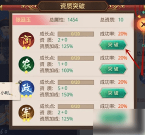 大家现在里面选择一个要资质突破的名臣,点击选中即可