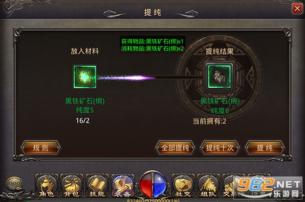 两个相同纯度的黑铁矿石,可以提纯成下一级别纯度的黑铁矿石。提纯成功率为100%