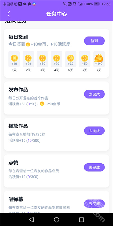 3、在打开的新页面里,你可以通过签到、发布作品、点赞等途径完成相应任务来获取金币,当金币积累到一定数量后,就能兑换钻石了。