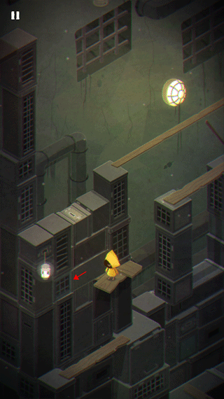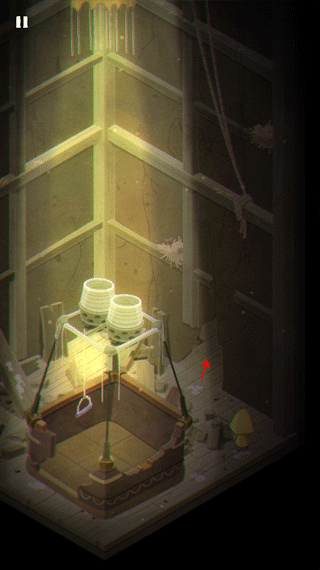 1、游戏的开端是摩诺利用门来抵御外部的攻击,第一关时,摩诺处于一个类似篮子的空间里,得按住上方的拉杆才能让自己落到地面。