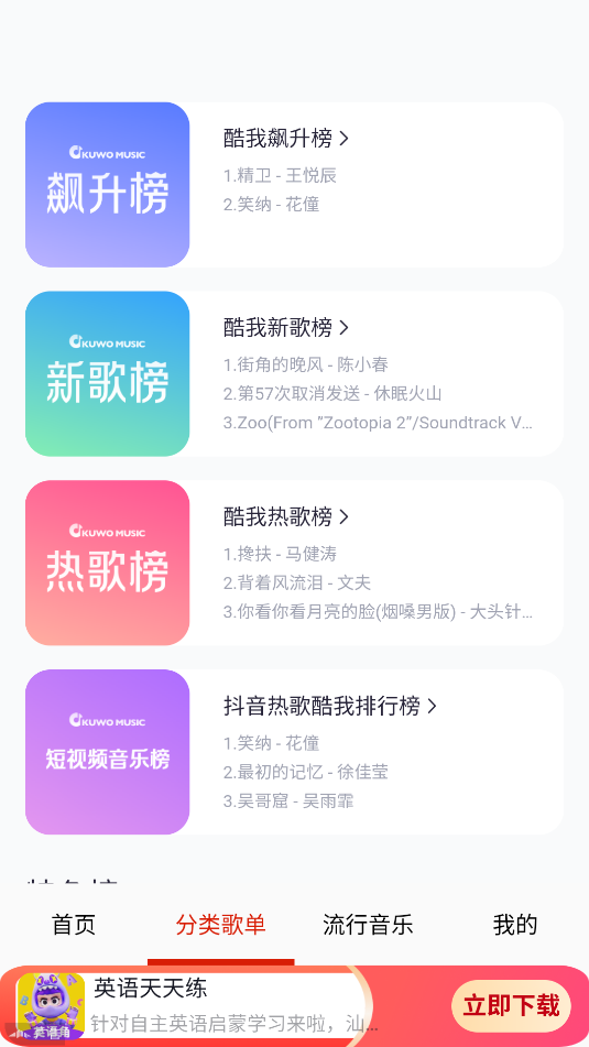 2、点击分类歌单,可以看到各种歌曲榜单,每一首都可以免费播放。