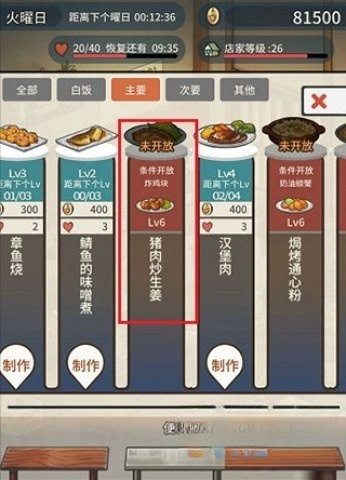 3、通过反复制作同一道料理,它会不断升级,让你解锁新菜式,比如当【炸鸡块】达到6级后,你就能制作【猪肉炒生姜】。