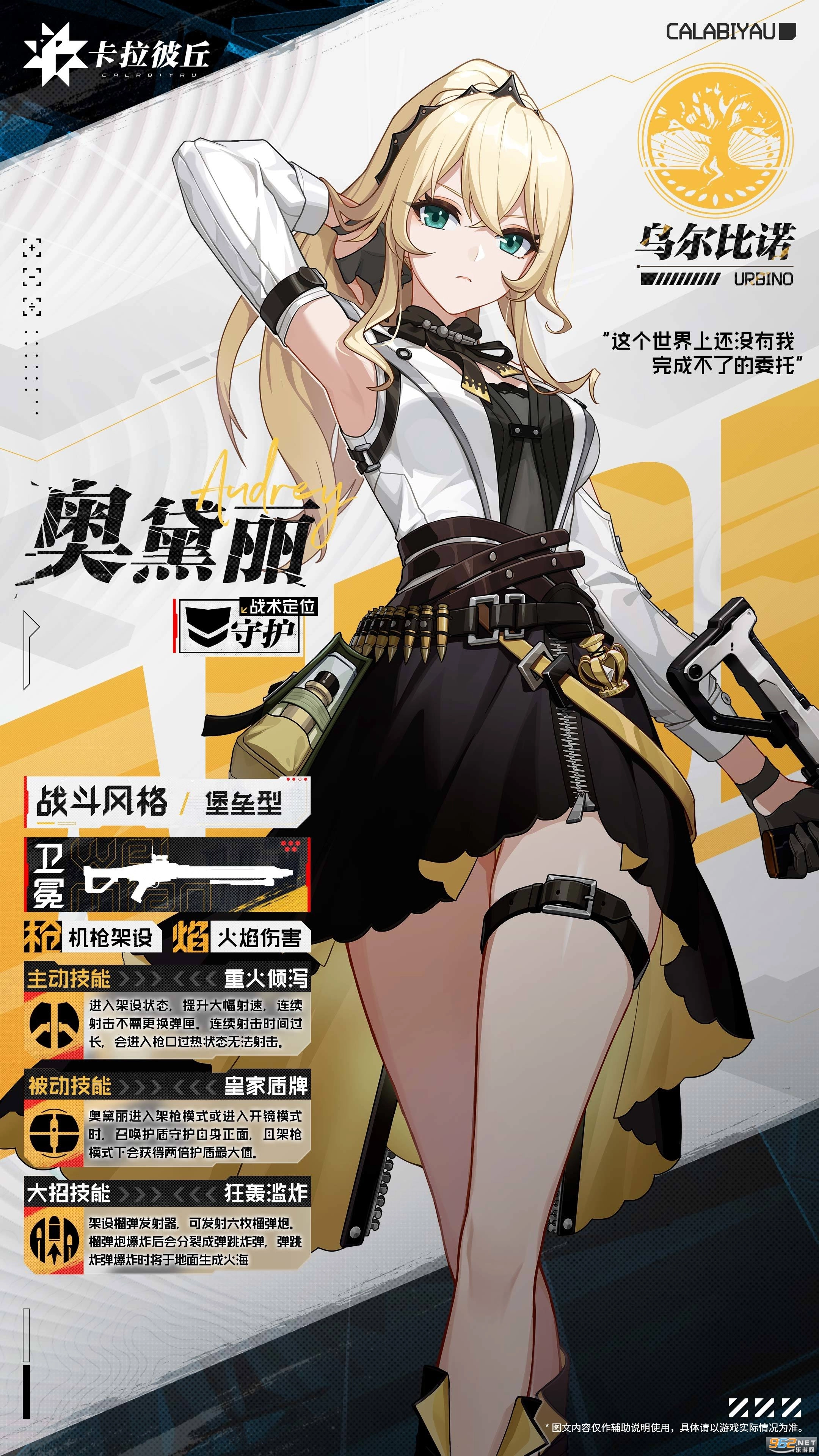 奥黛丽:守护型角色,架设机枪可持续输出,技能提升攻速并带护盾,觉醒3 能增加机枪灵活性,防守压制力强;