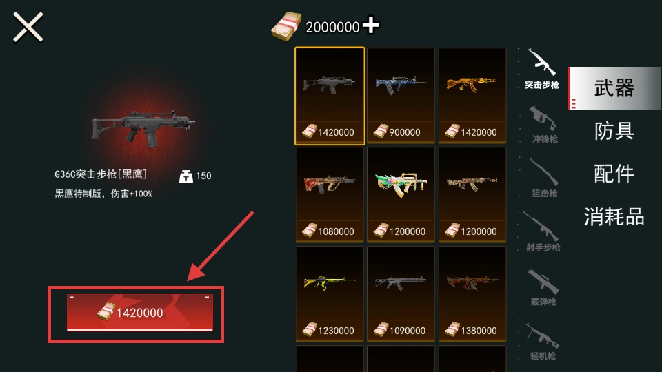 1、攒够【1420000】资金,优先购买【G36C-突击步枪[黑鹰]】,其伤害加百分百,强化战斗输出。