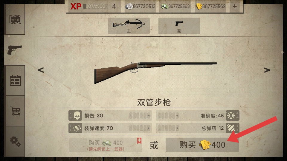 2、在武器界面中,选择【双管步枪】,点击【购买-400】按钮,消耗资源获取该武器。
