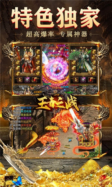 1、野外全地图支持任意PK,搭配多重助战模式,不仅有宝石掉落,更有整件装备爆出,不管是激情团战还是单人对决,都能让你畅享厮杀快感,收获满满惊喜!