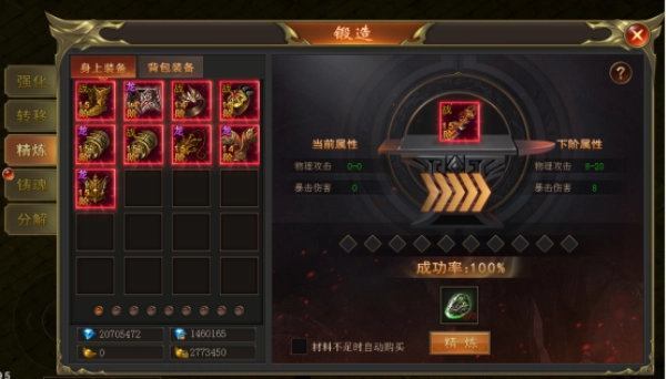 2、精炼:通过几率性的精炼从而提高人物的攻击和防御力。