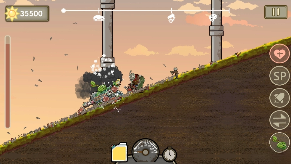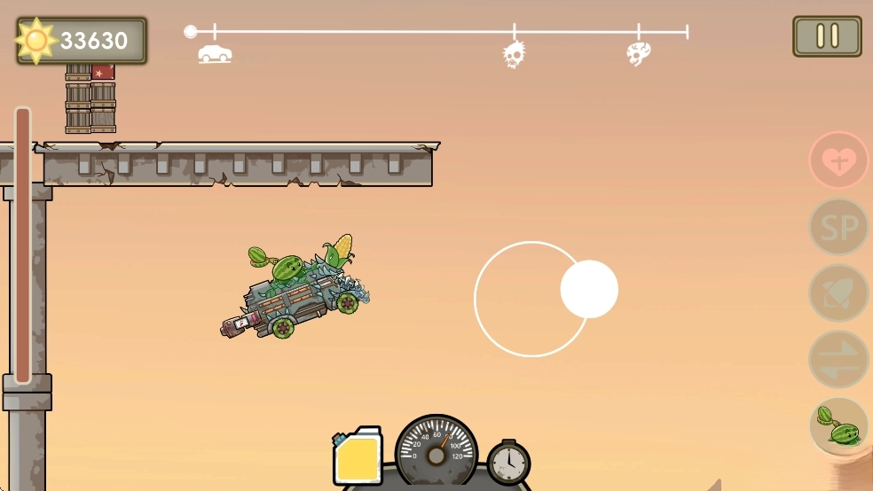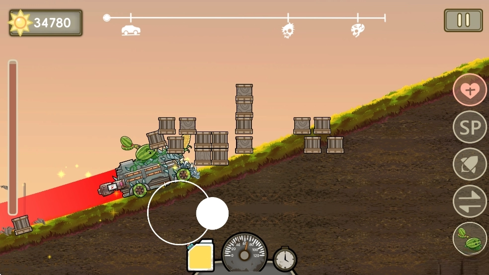 “戴夫房车” 闯末日风横版关卡,左手控制战车前进、跳跃及车头调整,右手操控车载植物武器 —— 用阳光购买豌豆、火焰西瓜等植物部署,按僵尸类型搭配输出或防御阵容,目标为抵达终点或消灭指定僵尸。