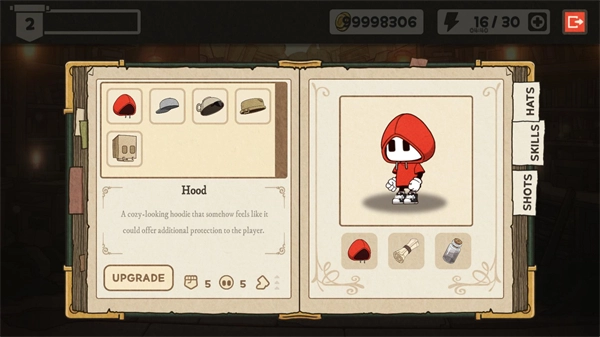 6、在主界面点击inventory可以装备不同的帽子来使用独特的能力,也可以对你的装备进行升级。