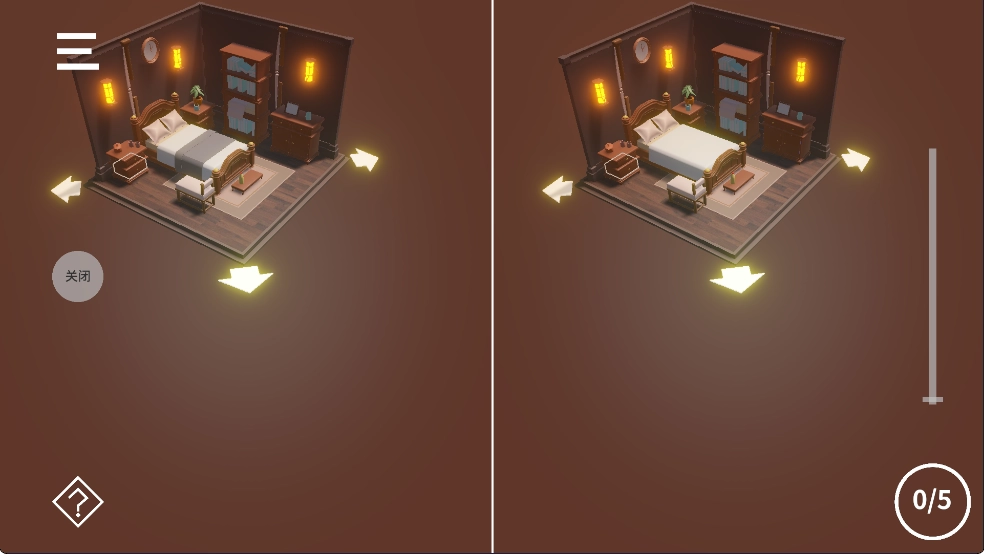 “对比区别”画面两侧房间场景,通过“放大缩小移动观察视角”和点击房间周边“箭头”改变观察中心视角来找到不同的物体,当所有不同的物体被找到时即可通关当前关卡。