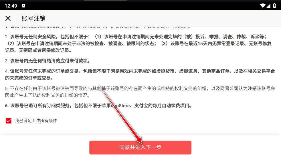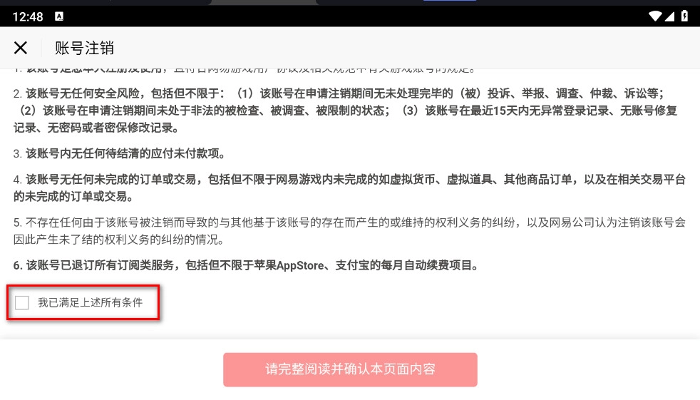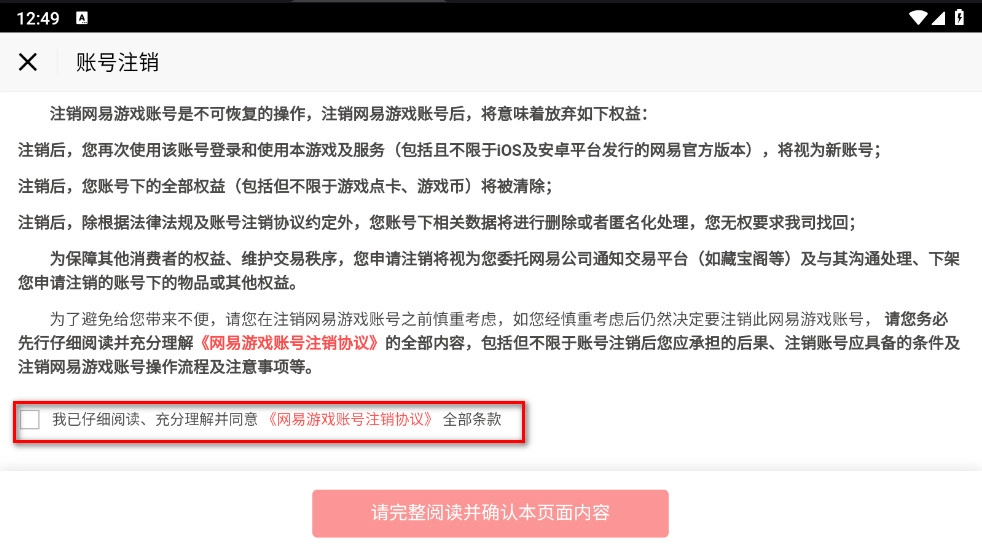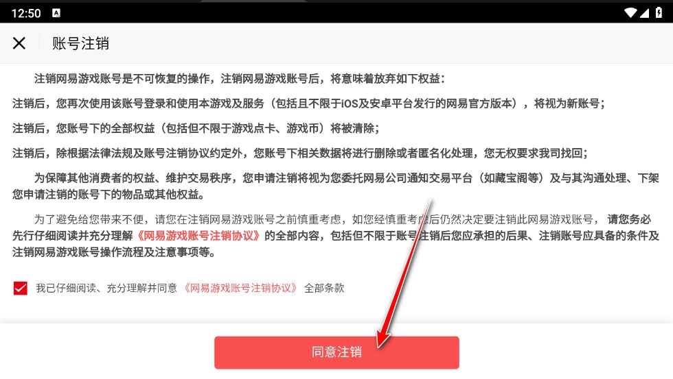 6.勾选这里的我已仔细阅读、充分理解并同意《网易游戏账号注销协议》全部条款