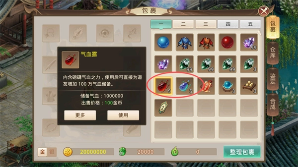8、找到“气血露”与“补灵玉”后直接使用,它们能提升血量和蓝量的储备量。在这些储备消耗完毕前,每次战斗结束后,玩家都无需手动使用补血补蓝的药品,十分省心省力。