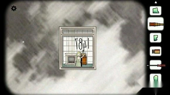 我们向右转,打开灯,依然是天花板灯盖里面,拿到钥匙,接着回到窗户这里,拉开窗帘,点近,用望远镜看月亮,发现可以一直放大,直到看到一场谋杀案,记下墙上的数字(1487)接着回到房间。