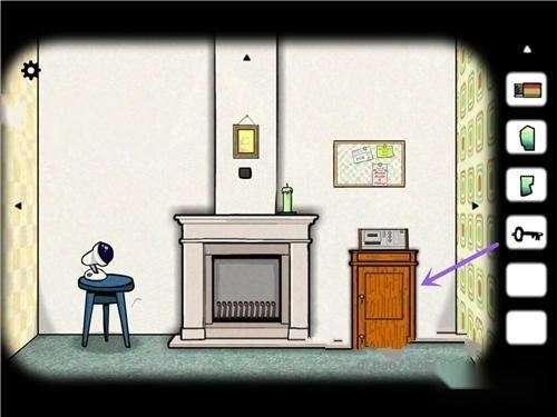 我们先默认面向有大型钟的那一面,点击盆栽旁的柜子,从抽屉里能拿到火柴和勺子。然后点击右转镜头切换到面对窗户的房间,按下墙上的灯泡按钮开灯,再点击向上按钮,从天花板的灯罩里取出一块相片碎片。之后回到窗户位置,再次点击窗户,会飘出另一块相片碎片。