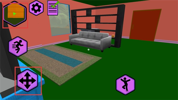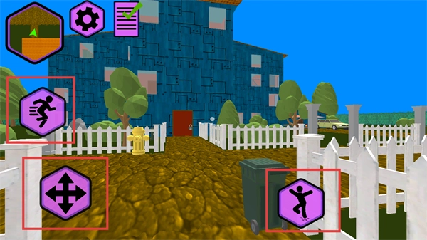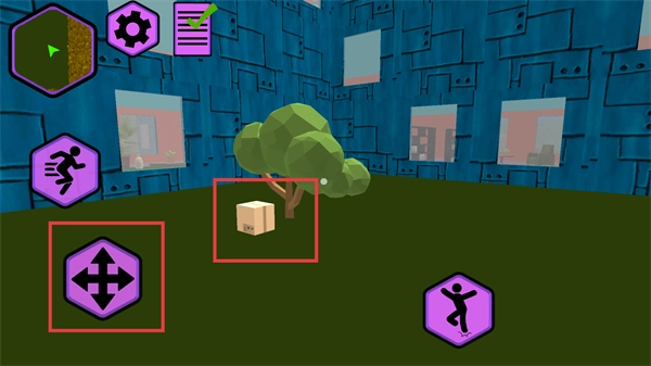 1、在游戏的户外初始场景里,有三类核心操作按钮被红框标注出来,它们用于操控角色进行移动和互动。