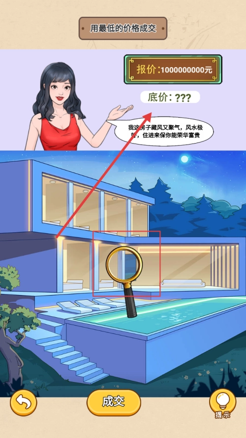 2、在房屋交易场景,用放大镜仔细观察房屋,寻找线索,以便知晓底价,实现用最低价格成交的目标。