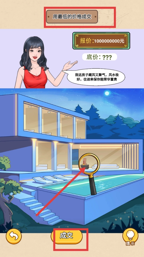 3、明确【用最低的价格成交】的任务,观察房屋后,点击【成交】按钮,尝试完成房屋交易。