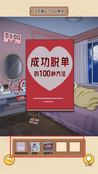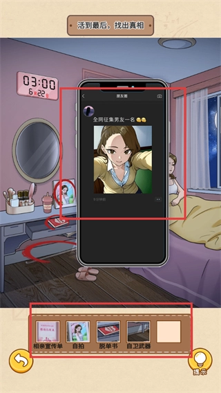 1、仔细查看卧室的环境,把床头柜上的【手机】【相框】之类的物品收集起来,再结合墙上【海报】所包含的信息,为接下来的操作储备线索。
