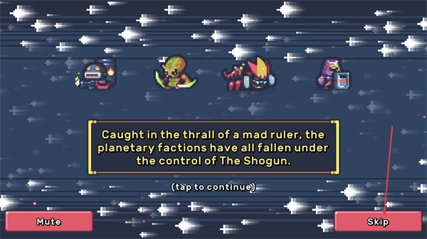 1、该界面展示游戏背景剧情,文字说明行星派系被疯狂统治者控制,点击界面或Skip按钮可跳过剧情,继续进入游戏流程。