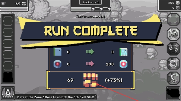 4、出现RUNCOMPLETE提示代表关卡完成,可查看本次获得的资源与进度提升,后续可挑战更高难度内容解锁新功能。