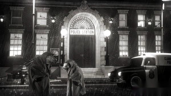 游戏流程里绝大部分画面都采用黑白配色,整体延续了上世纪四五十年代黑色电影(Film noir)的风格基调,玩法上更偏向AVG类型,包含大量对话与文本内容,再配上经典影视质感的配音演绎,玩起来就像沉浸观看一部真实的侦探影片。而且每次场景切换都会搭配不同的过场动画,其中甚至融入了枪战对决、惊险逃脱等精彩桥段。游戏内还穿插着不少讽刺与调侃的元素,在张力十足的粗犷剧情线中,又点缀着大量荒诞幽默的细节,让整体体验更添趣味。