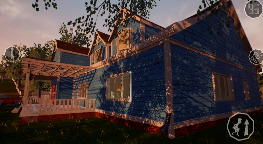 4、进入游戏,来到邻居门口,不能被他发现,抓到,追逐玩法非常之刺激,欢迎大家尝试!