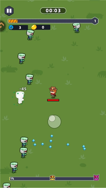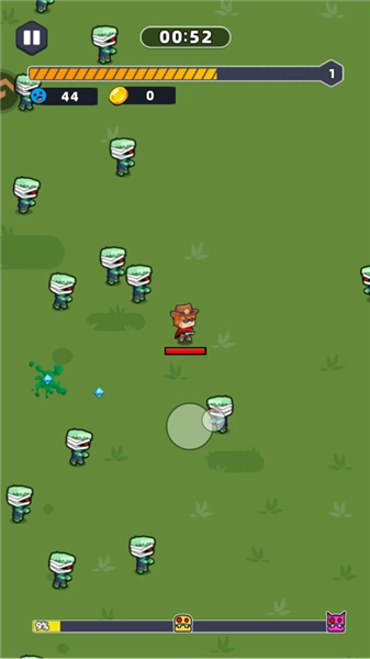 2、指尖移动控制角色进行移动,拾取经验,打败敌人。