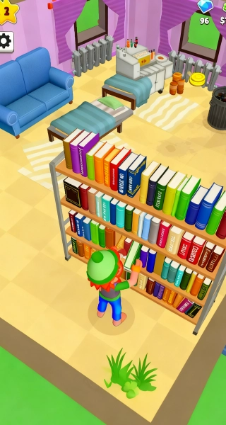 3、来到有书架的房间,操控角色走到书架旁,挑选需要整理或放置的书籍,将其准确摆放到对应位置,有序规整书架,既能优化房间布局,也能推进房间的完善进度。